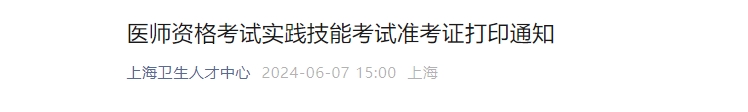 上海市医师资格考试(考区)办公室发布关于2024年医师资格考试实践技能考试准考证打印通知,生于6月7日15点之后在国家医学考试网下载准考证。通知详情如下: