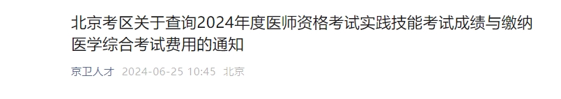 北京市卫生健康人力资源发展中心发布北京考区关于查询2024年度医师资格考试实践技能考试成绩与缴纳医学综合考试费用的通知,实践技能考试成绩查询时间为6月25日起,通知详情如下: