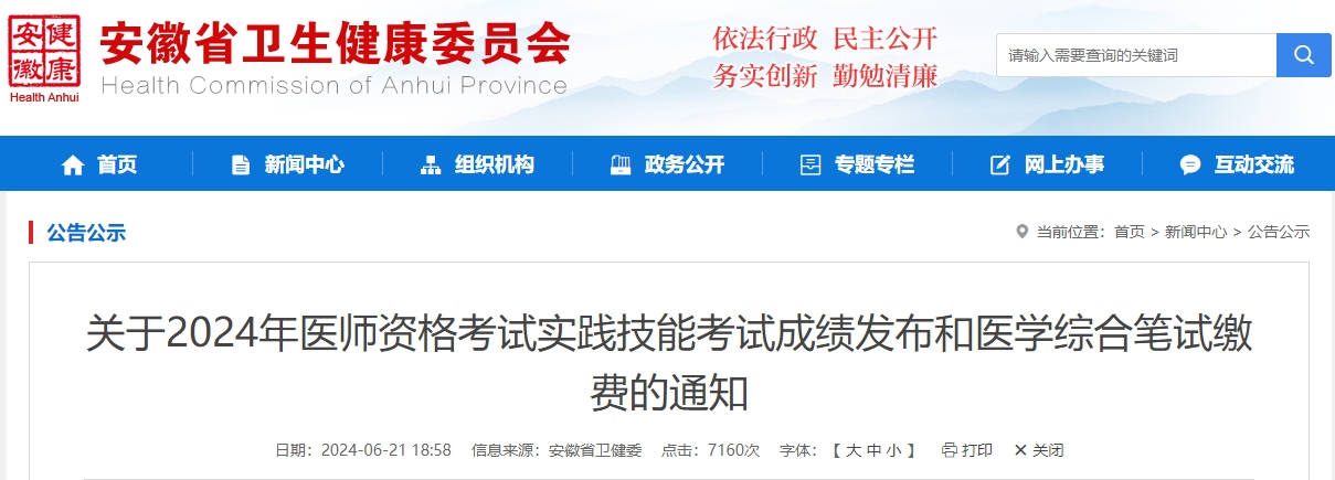安徽省卫生健康委员会发布关于2024年医师资格考试实践技能考试成绩发布和医学综合笔试缴费的通知,医学综合笔试网上缴费时间为6月25日至7月25日,通知详情如下: