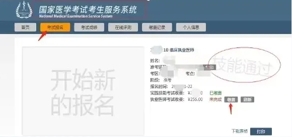 特别提醒:医学综合考试缴费入口仅对实践技能考试结果为“技能通过”和“技能免考”考生开放。实践技能考试结果为“未通过”和非“技能免考”考生无此入口,请考生认真核实技能考试结果和技能免考情况。