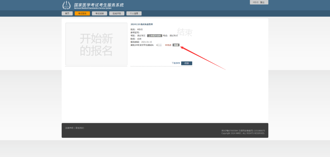 当返回国家医学考试考生服务系统页面正常显示情况下,如果缴费状态还是未完成,可点击刷新按钮进行缴费状态刷新。