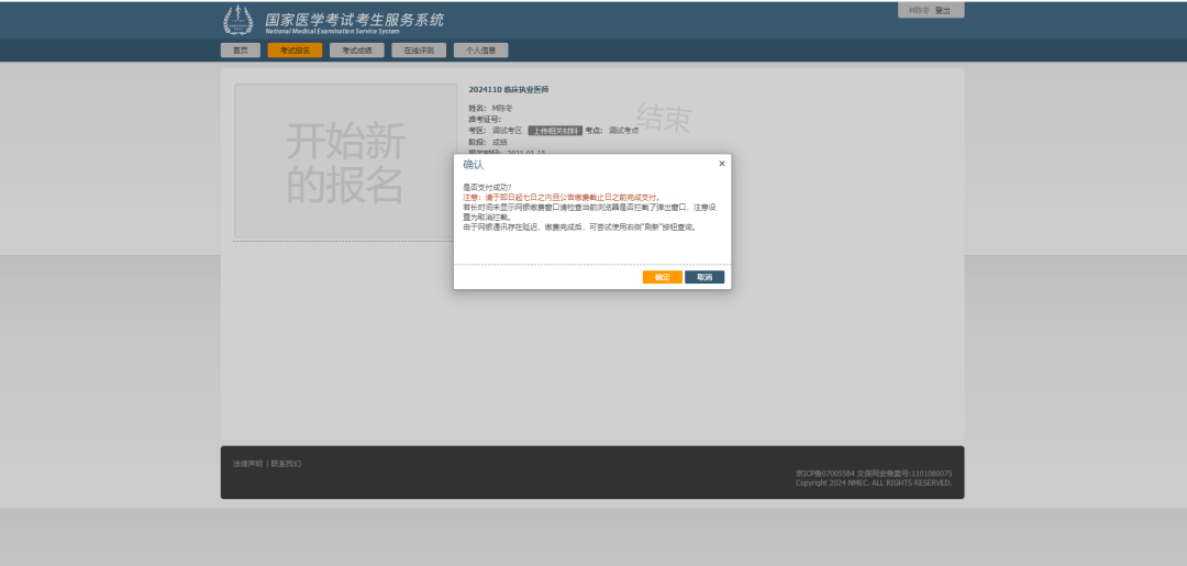 第六步:返回国家医学考试考生服务系统后根据弹框提示点击确定或取消。