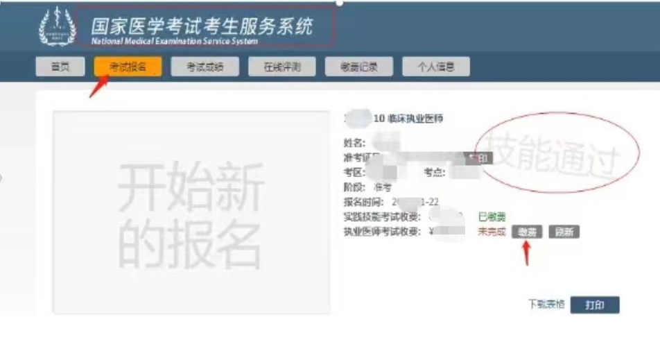 特别提醒:医学综合考试缴费入口仅对实践技能考试结果为“技能通过”和“技能免考”考生开放。实践技能考试结果为“未通过”和非“技能免考”考生无此入口,请考生认真核实技能考试结果和技能免考情况。