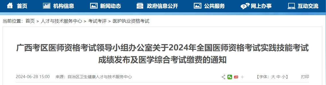 广西考区医师资格考试领导小组办公室发布关于2024年全国医师资格考试实践技能考试成绩发布及医学综合考试缴费的通知,广西考区实践技能考试成绩已公布。通知详情如下: