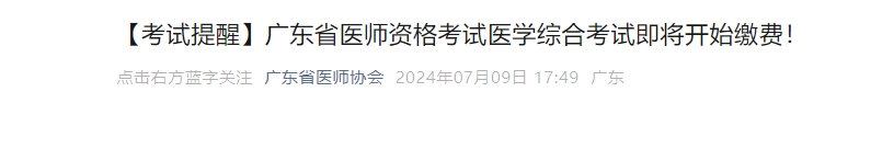 医师资格考试广东省考区办公室发布关于广东省医师资格考试医学综合考试即将开始缴费!医学综合考试缴费时间为7月15日0时-7月26日24时,通知详情如下: