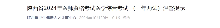 陕西省卫生健康人才外事中心发布关于陕西省2024年医师资格考试医学综合考试(一年两试)温馨提示,通知详情如下: