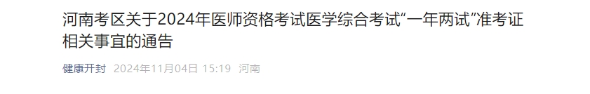 河南考区2024年医师资格医学综合考试“一年两试”准考证打印通告 发布时间:2024-11-04 15:25:16 河南考区关于2024年医师资格考试医学综合考试“一年两试”准考证相关事宜的通告,“一年两试”准考证打印服务功能于2024年11月5日在全省范围内开通,通知详情如下: 根据国家医师资格医学综合考试“一年两试”工作统一部署,结合我省实际,河南考区将于2024年11月5日在全省范围内开通“一年两试”准考证打印服务功能。我省考生可凭借个人账户信息直接登陆国家医学考试网自行打印准考证,并依照准考证相关信息,提前做好考前各项准备事宜,按国家医考相关要求按时参加指定场次考试。 2024年11月4日