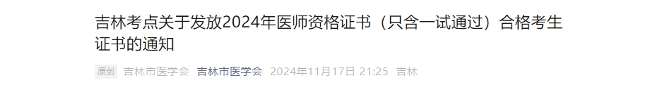 吉林考点2024年医师资格证书(只含一试通过)合格考生证书发放通知