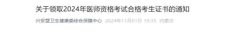 内蒙古兴安盟关于领取2024年医师资格考试合格考生证书的通知