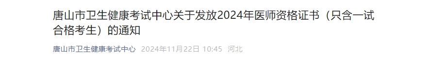 河北省唐山市卫生健康考试中心关于发放2024年医师资格证书(只含一试合格考生)的通知,通知详情如下: