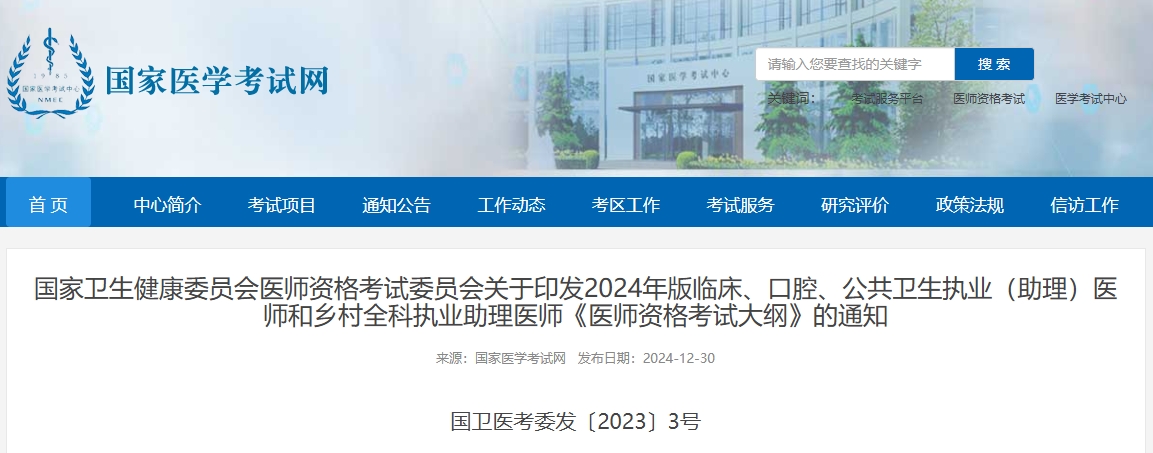 国家卫生健康委员会医师资格考试委员会关于印发2024年版临床、口腔、公共卫生执业(助理)医师和乡村全科执业助理医师《医师资格考试大纲》的通知,国卫医考委发〔2023〕3号,通知详情如下:
