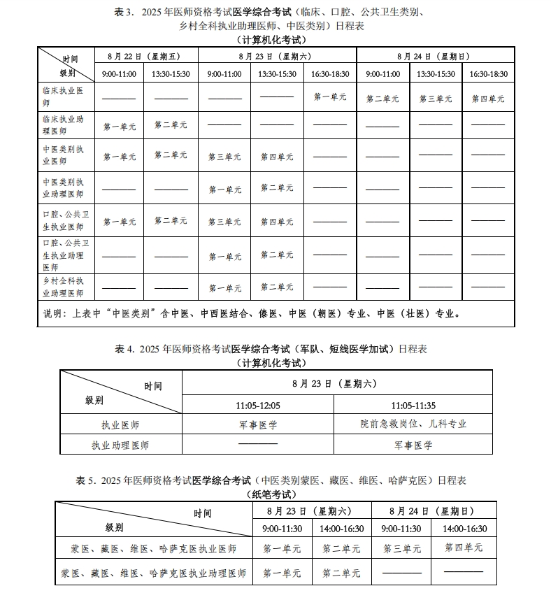 2025年医师资格考试医学综合考试(计算机化考试)时间为8月22日至24日,每单元时长2小时。医学综合考试(纸笔考试)时间为8月23日至24日,每单元时长2.5小时。2025年医师资格考试医学综合考试“一年两试”试点(计算机化考试)时间为11月8日至9日,每单元时长2小时。