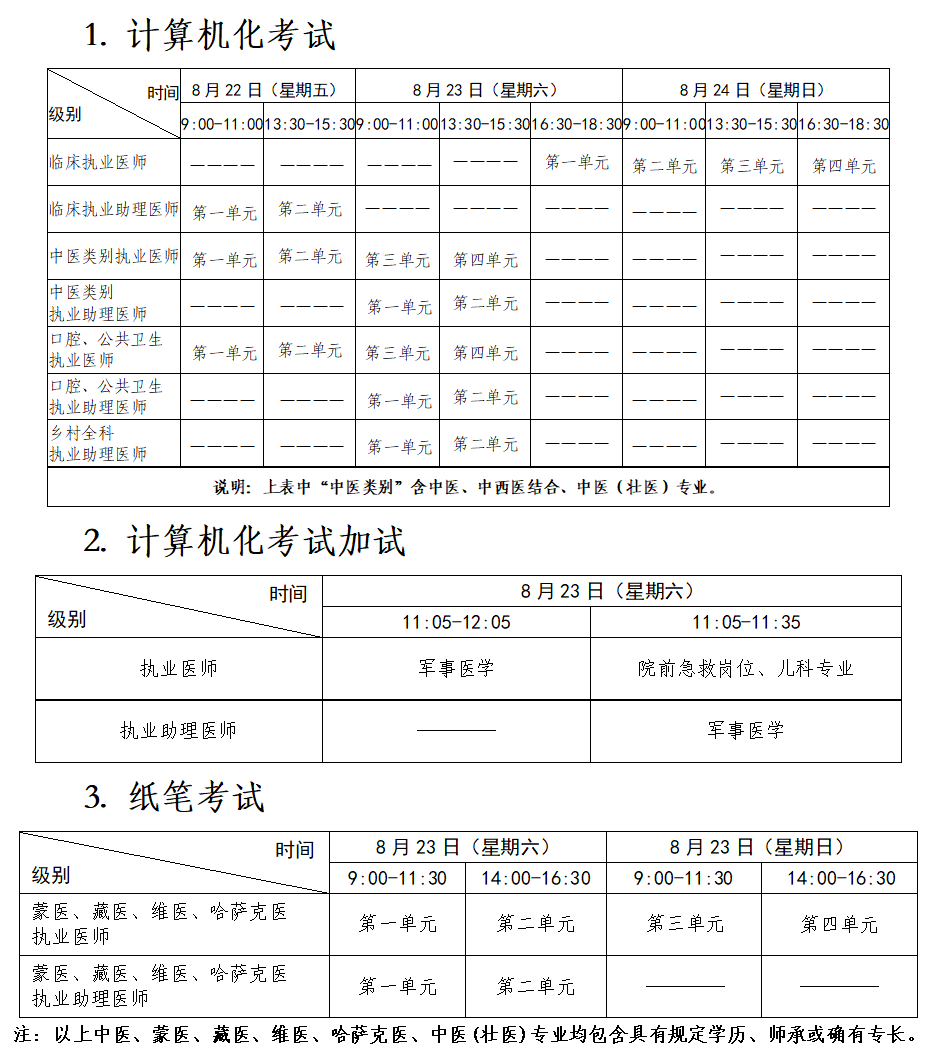 (一)熟悉考试相关设计。医学综合考试实行计算机化考试,军队现役人员加试军事医学,院前急救岗位和儿科专业加试相应内容。中医类别蒙医、藏医、维医、哈萨克医专业实行纸笔考试。