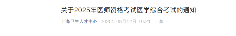 上海市医师资格考试(考区)办公室发布关于2025年医师资格考试医学综合考试的通知,医学综合考试将于8月22-24日举行,考生于8月15日上午10点起在国家医学考试网下载准考证。通知详情如下:
