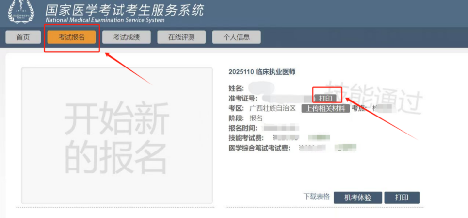 二、河北考区将于8月15日9:00开放考生准考证打印功能,请广大考生及时登陆国家医学考试网(www.nmec.org.cn),进入“国家医学考试考生服务系统”--“个人界面”,点击准考证号后的“打印”按钮,打印准考证(如下图)。