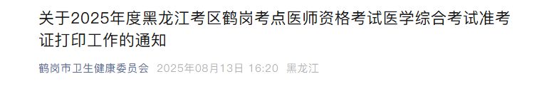 黑龙江鹤岗市医师资格考试委员会办公室发布关于2025年度黑龙江考区鹤岗考点医师资格考试医学综合考试准考证打印工作的通知,通知详情如下: