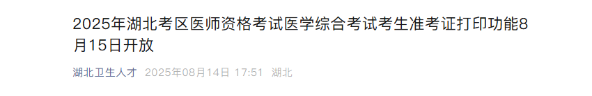 湖北考区2025年医师资格医学综合考试准考证8月15日开放打印