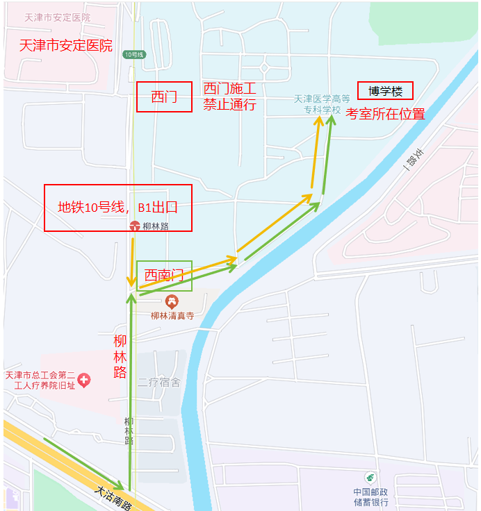 请在天津医学高等专科学校考场(以考生本人准考证信息为准)参加8月22-24日2025年医师资格考试医学综合考试的考生注意:因学校原入口“西门”进行修缮维护,禁止通行,请考生从学校“西南门”进出考场(西南门距离原入口“西门”约300米,门口设有指示牌),请考生根据学校安保人员指引有序进出。因此给您带来不便,敬请谅解。