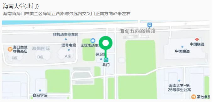海南大学海甸校区北门(海口市美兰区海甸五西路,北门步行至考场大约需要10分钟,请考生提前安排时间。)