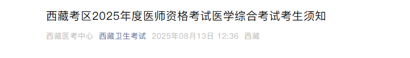 西藏卫生健康委员会发布关于西藏考区2025年度医师资格考试医学综合考试考生须知,医学综合考试于8月22日-24日举行,医学综合考试准考证打印功能于2025年8月13日开通。通知详情如下: