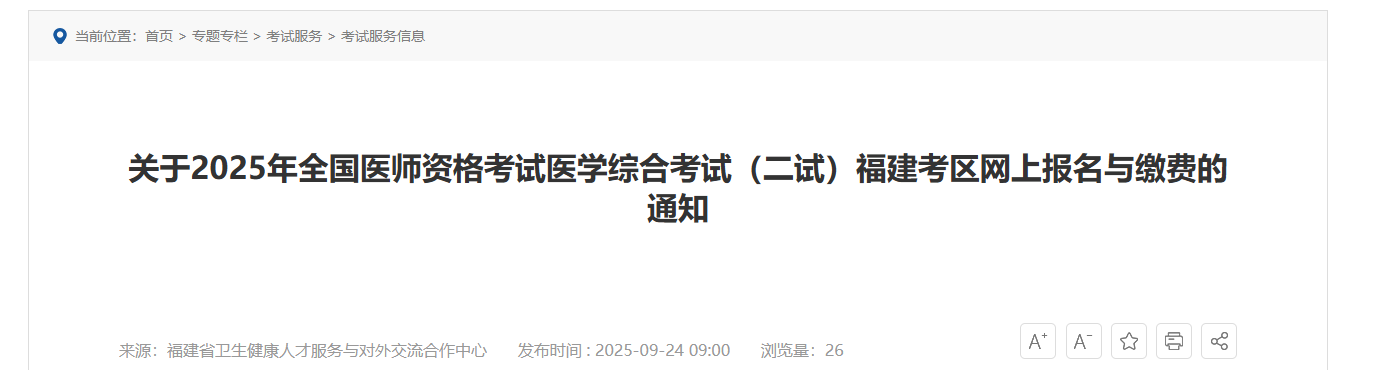 福建考区2025年医师资格考试(二试)网上报名与缴费的通知
