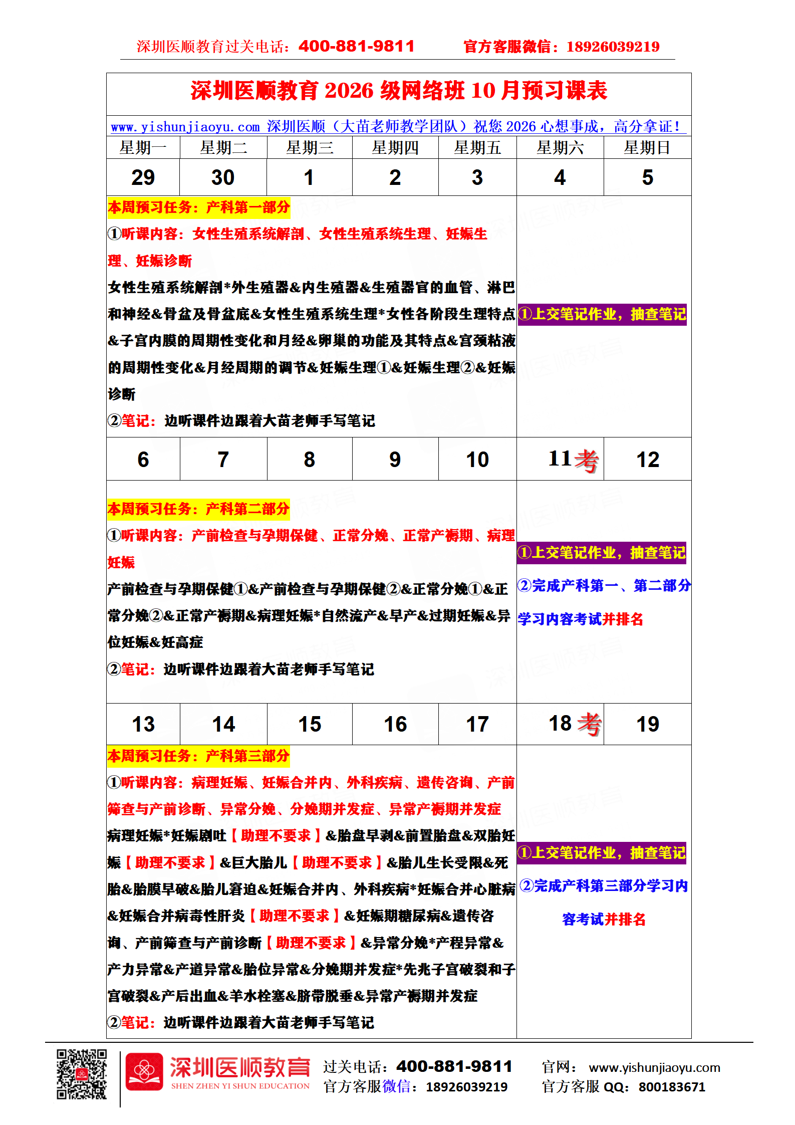 深圳医顺教育2026级网络班10月预习课表