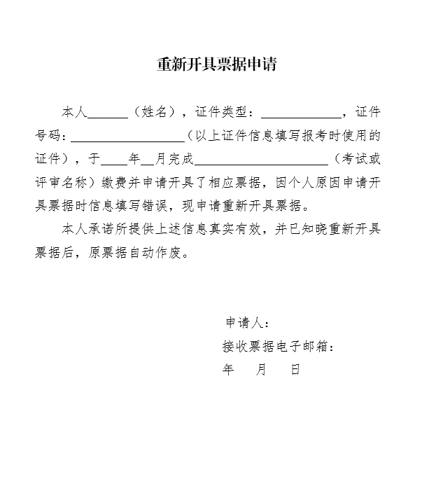 (九)获取票据后,开票信息有误,需要重新开具的考生,请填写以下申请并联系北京市卫生健康人力资源发展中心进行处理。